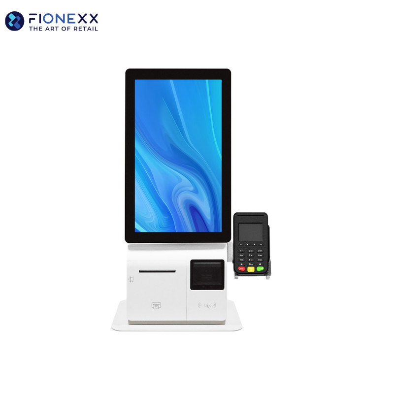 Quiosque de Pedidos de Autoatendimento, Design robusto e compacto, ideal para restaurantes e take-aways, com impressora integrada e scanner QR de alta velocidade.