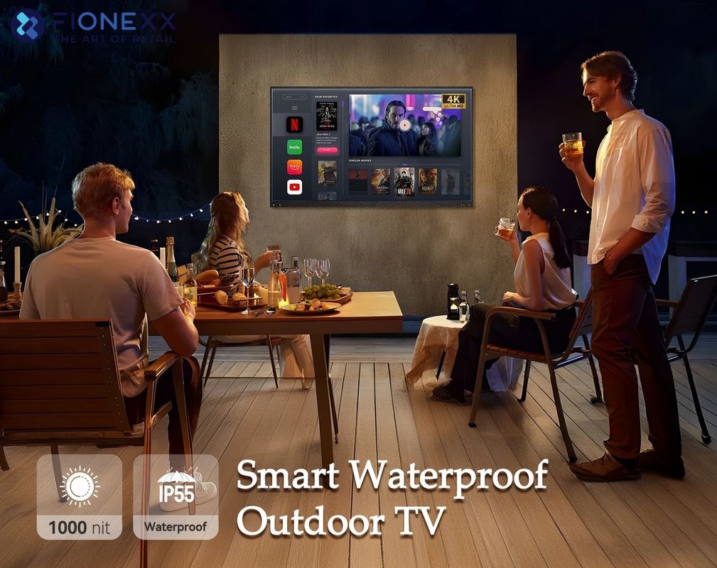 A tela 4K HDR de ultra-alta definição atualizada. O modelo mais recente da série Fionexx está equipado com uma tela 4K UHD HDR de alta qualidade, usando tecnologia de retroiluminação LED direta, que é 50% mais brilhante que as TVs internas e pode apresentar imagens surpreendentes e vívidas em ambientes externos.